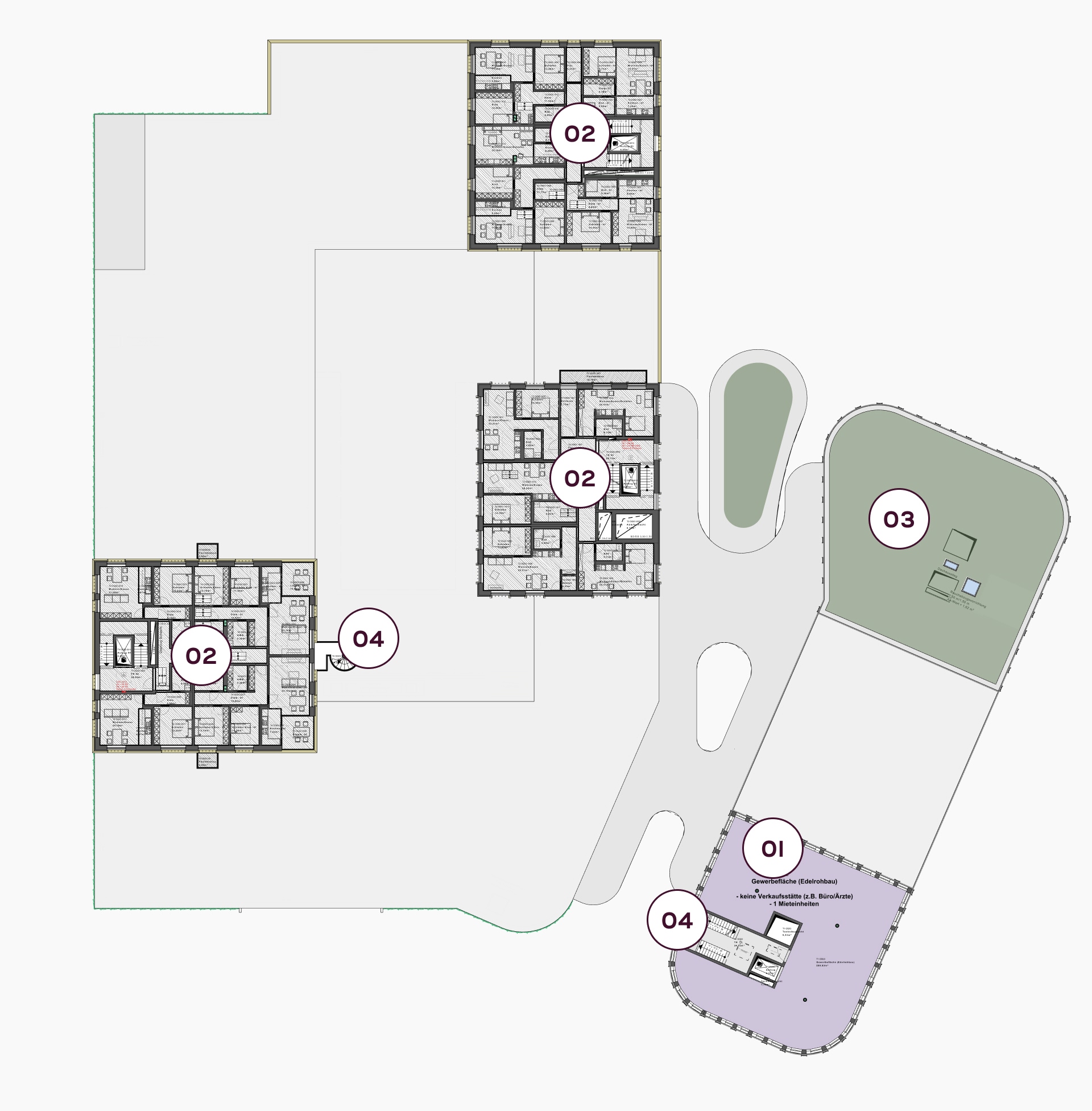 Im vierten Obergeschoss stehen moderne Wohneinheiten in zwei Gebäudeblöcken im Mittelpunkt. Ergänzt wird die Ebene durch begrünte Innenhof- und Dachflächen, die für zusätzliche Aufenthaltsqualität sorgen und ein ruhiges, wohnorientiertes Umfeld schaffen.